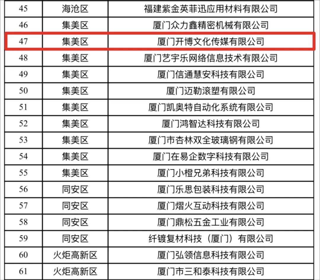 近日,厦门开博文化传媒有限公司凭借其卓越的创新能力与行业贡献,成功通过“创新型中小企业”认定,标志着公司在数字化营销、技术创新及专业化服务领域的实力获得权威认可!作为广告行业的先锋力量,开博文化通过自主研发技术、创新服务模式及深度市场洞察,持续推动行业高质量发展,成为集美区十家获得此殊荣企业的其中一员。